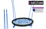 Качели-гнездо Midzumi выполнены из металлической рамы диаметром 60 сантиметров, с дополнительной защитной оплеткой ее бортиков, обтянутых прочным синтетическим канатом толщиной 10 мм выдерживающим нагрузку 100 кг. Плетеное синтетическое сидение качелей удобное и практичное, не собирает грязь и воду, при сильных загрязнениях его можно протереть.