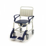 Также модель оснащена пластиковым съемным санитарным судном, которое находится под сиденьем. Оно легко моется, а одноразовые гигиенические пакеты делают уход за больным еще проще. При необходимости судно можно снять, а кресло разместить над унитазом. Ручка на спинке предназначена для перевозки пациента на стуле сопровождающим. Подножки кресла-туалета можно снять.