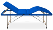 Складной трёхсекционный стол выполнен из экологичных материалов, имеет качественную обивку, которая легко очищается и по характеристикам превосходит даже натуральную кожу, позволяя столу сохранять былой вид даже через много лет, а крепкая конструкция выдержит высокую нагрузку до 200 кг. Это достижимо благодаря использованию при производстве рамы влагостойкой фанеры, а ножек — алюминия. При этом прочность и надежность конструкции выгодно отличают стол от аналогичных моделей. У данной модели есть возможность регулировать высоту от 650 до 900 мм с шагом в 50 мм. Мягкое покрытие стола выполнено из упругого полиуретана, который отлично принимает форму тела и не вызывает дискомфорта. Полиуретан покрыт высококачественной искусственной кожи, неприхотливой в обслуживании, обладающей высокой износостойкостью и устойчивой к загрязнениям.